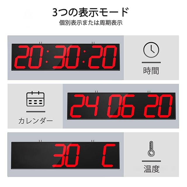 明るさ調節可能: 大型デジタル壁掛け時計の目を引くLEDの数字は明るさを調整することができ、異なる照明条件に合わせてカスタマイズすることができます。8段階の明るさ調節が可能です。また、自動感知モードを選択すれば、環境の変化に応じて自動的に明るさを調節することもできます。