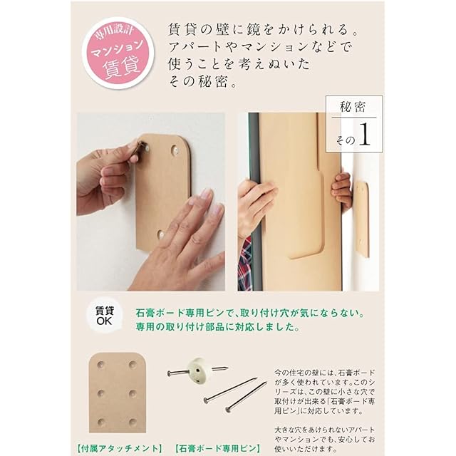 アパート・マンションなど賃貸の壁にも、穴を気にせず掛けられる「石膏ボードピン」に対応。[対応 壁下地OK素材(付属ピン使用) : 石膏ボード / 下地△素材 : 合板・木(別途ビスを購入ください)/ 下地NG素材 : コンクリート、タイル]