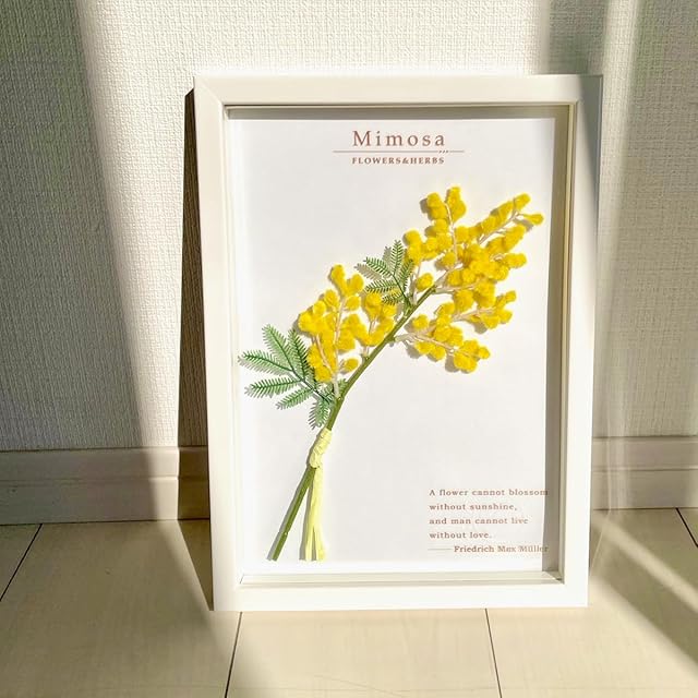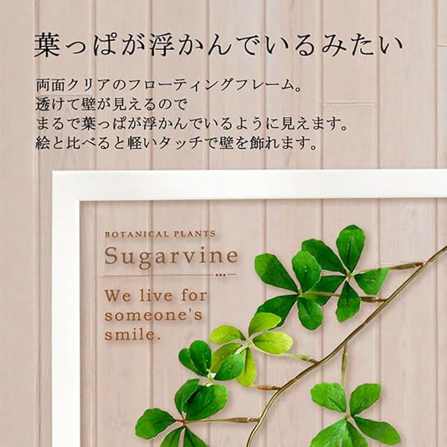 両面ガラスにフェイクグリーン&フラワー(模造の葉っぱやお花)を収めた壁飾り。 あゆわらで1点1点手作りしているこだわりの作品。 壁掛けなので場所いらず、水やりなしの手間いらず。 枯れないので、ずっとお部屋を彩ってくれる逸品です。 アインシュタイン、サンテグジュペリ、 マックスミューラー。 歴史に名を残す偉人が残した数々の名言を作品の中にデザイン。 ふとしたときに、名言を振り返ると、日々の生活が豊かになりそう。 「シュガーバインの名言」 “We know from daily life that we exist for other people first of all, for whose smiles and well-being our own happiness depends.” ーAlbert Einsteinー “ほかの誰かの元気な笑顔のために自分が生きていることを、私たちは知っている。それは自分の幸福を支えてくれているんだ” ーアルベルト・アインシュタインー 「ラベンダーの名言」 “Love does not consist in gazing at each other, but in looking together in the same direction.” ーSaint-Exuperyー “愛はお互いを見つめ合うことではなく、ともに同じ方向を見つめることである。” ーサンテグジュペリー 「ミモザの名言」 “A flower cannot blossom without sunshine, and man cannot live without love.” ーMax Mullerー “花は太陽なしでは花を咲かせられず、人は愛なしでは生きられない。” ーマックス・ミュラーー 箱から出してそのままでも飾れますが、「あゆわら」オリジナル刻印入りの白い背景のシートを外すと、まるでフレームの中にグリーン・お花と名言がふわっと浮かんでいるような両面クリアになる2way仕様のフローティングフレームです。 ※名言の入ったクリアシートを外すこともできます ガラスフレームに入ったアーティフィシャルフラワーなので、お水をあげる必要もなく、ホコリもつかなくて、お手入れいらず。いつまでもきれいに飾ることができます。 アートフォト・水彩画・リーフパネル・風景画などの絵画・アートフレーム、フォトフレームなどをインテリアとしてお部屋に飾り、癒やしの空間を演出しませんか? 新築祝い、開店祝い、結婚祝い、出産祝いや誕生祝いなどのおしゃれなギフト(贈り物)としても好評です。