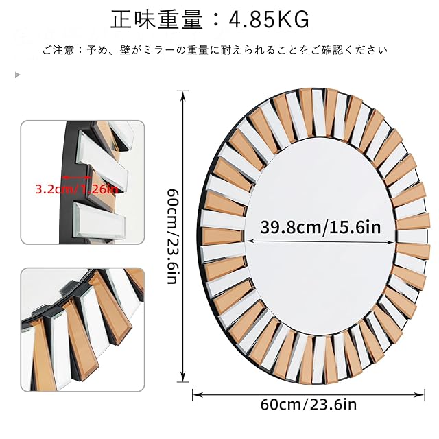 【圧迫感がないサイズ】直径60cmのサイズがお壁にかけても圧迫感を感じにくいこのサイズ。角がない円形ミラーは、圧迫感が少なく、シンプルで他のインテリアと調和しやすく。お部屋の高級感を引き立たせてくれます