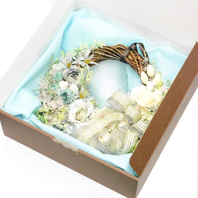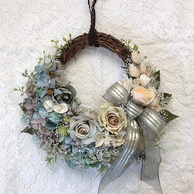 ブルーグレー〜ホワイトのグラデーションで、 シャビーシックな雰囲気を出したハーフムーン型の春リースです。