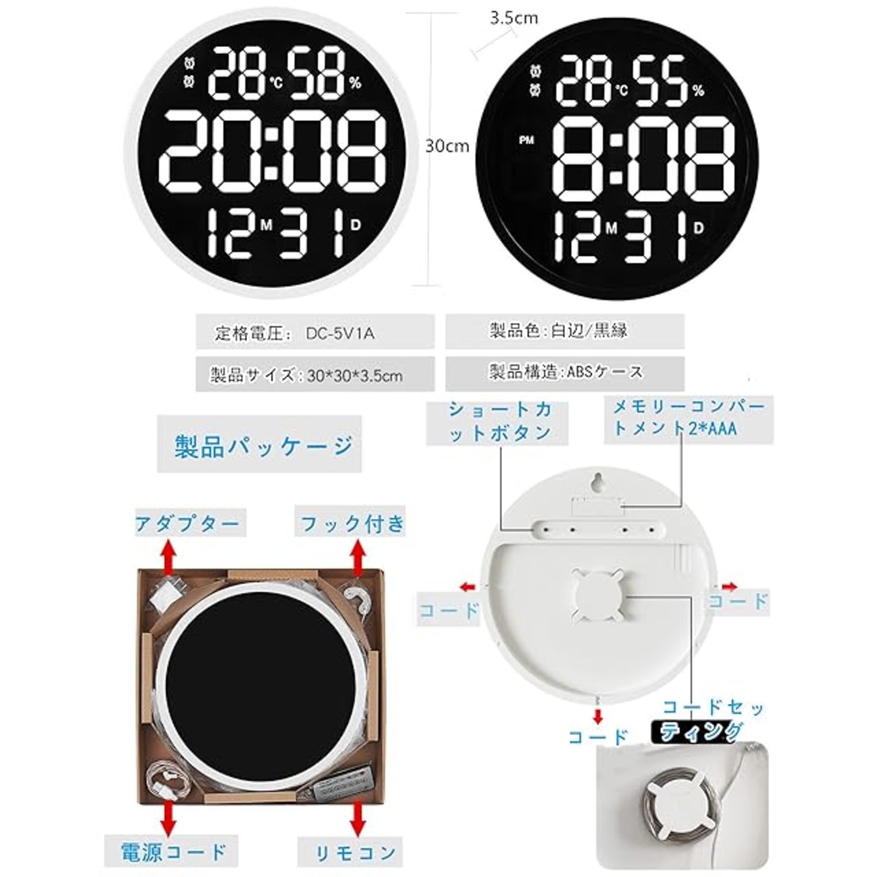 ■【時計サイズ】10インチ25.4*25.4*3CM,12インチ:30×30×3.5cm 材質:プラスチック/LEDデジタルミラー 商品内容:フック、リモコン、USBケーブル。 ◆本製品は電池ではありませんのでご注意ください。