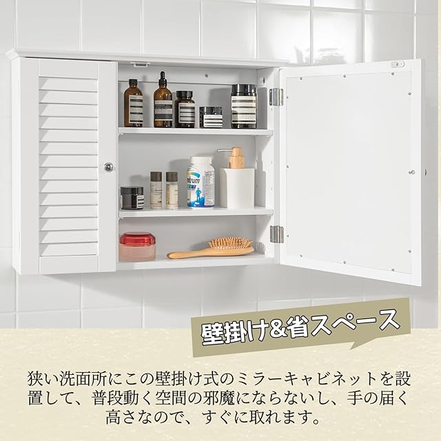 【壁掛け&省スペース】狭い洗面所にこの壁掛け式のミラーキャビネットを設置して、普段動く空間の邪魔にならないし、手の届く高さなので、すぐに取れます。