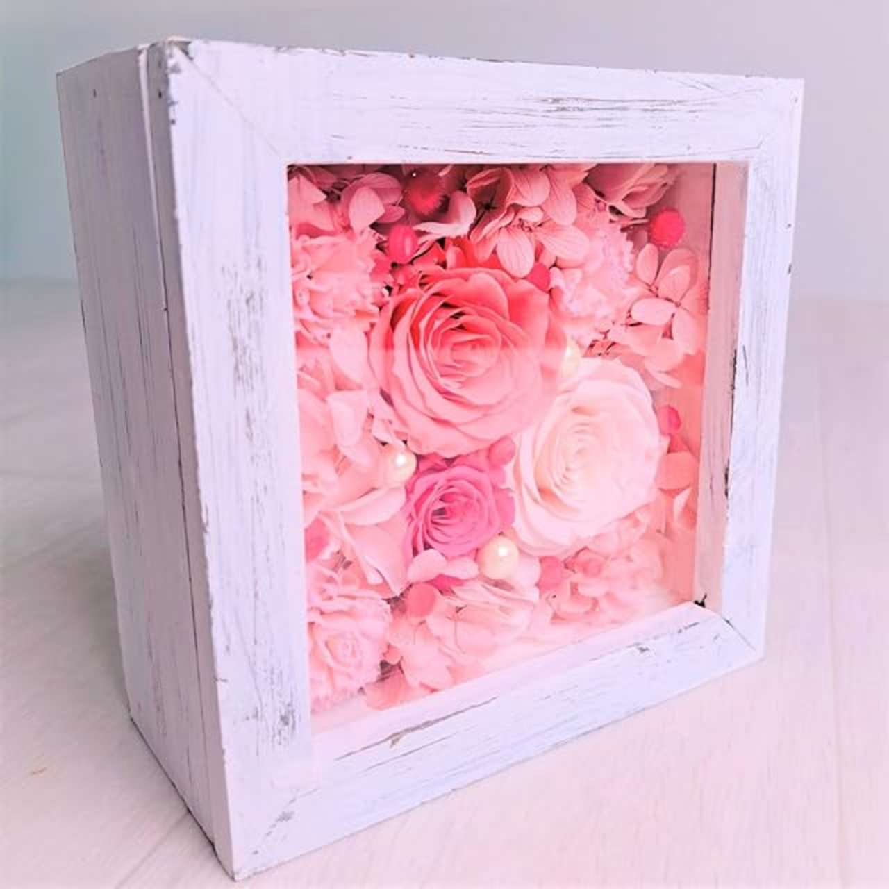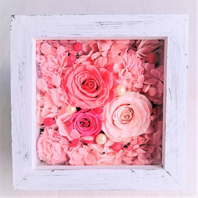 高さ15㎝× 幅15㎝× 奥行7cm のボックス入りプリザーブドフラワーアレンジメントです。 アンティーク加工がオシャレなガラス窓付ウッドボックス(白)に入っています。 ボックスにはアンティーク加工を施してある為、独特の塗装の加工がございます。 プリザーブドフラワーやドライフラワーは天然素材の為、花びらに多少のひび割れ等がある場合がございます。 天然素材につき、お花の大きさ・形・色は季節や出荷状況により若干異なる場合がありますが、ボリューム・質感は変わらずに制作いたします。