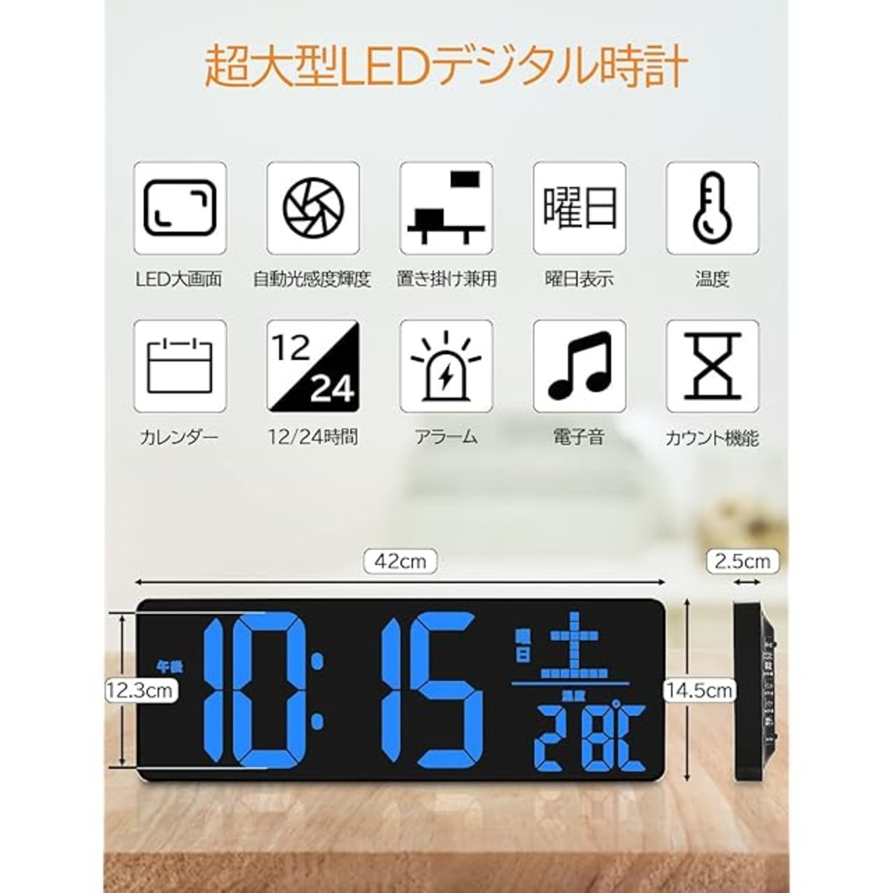 YTCYKJ デジタル時計 壁掛け 大型 LED大画面 LED電子時計 目覚まし時計 卓上 アラーム 見やすい 壁掛け置き兼用 明るさ調整可能 大音量 タイマー機能 スヌーズ機能 時間/日期/温度表示 12H/24H時間表示 AC電源 リモコン操作 家/オフィス/公共の場 42*14.5*4.5cm (ブルー)