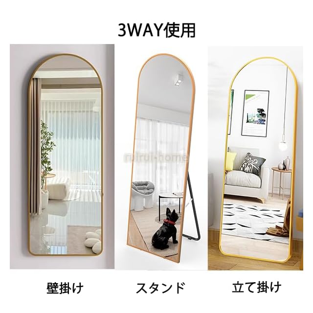 全身鏡 姿見鏡 2Way アルミフレーム アーチ型 飛散防止加工 折りたたみ 壁掛け 両用 おしゃれ 丸角 洗面所 化粧 浴室 お風呂 玄関 65*170CM シルバー