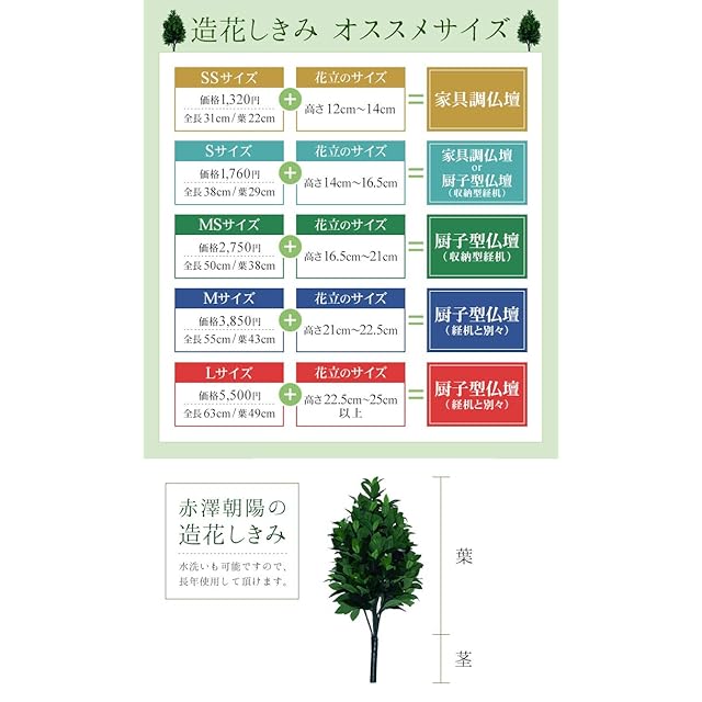 自然な風合いの繊細デザイン - 赤澤朝陽の造花しきみは、本物のしきみを模した造花しきみで、仏壇回りを自然に彩ります。
