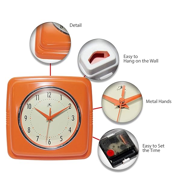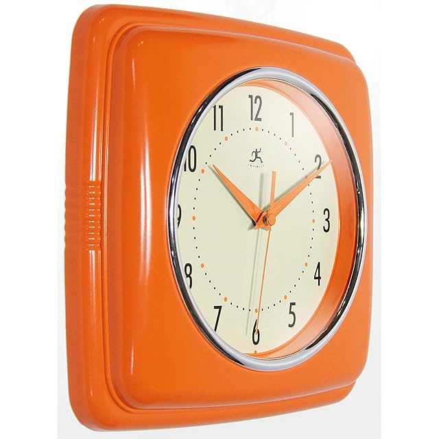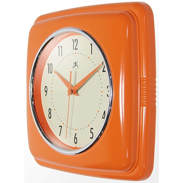 インフィニティ・インストゥルメンツ レトロ – 9インチ スクエア サイレント カチカチ音を立てない ミッドセンチュリー モダン – キッチン、学校、教室– ビンテージ装飾 – オレンジ