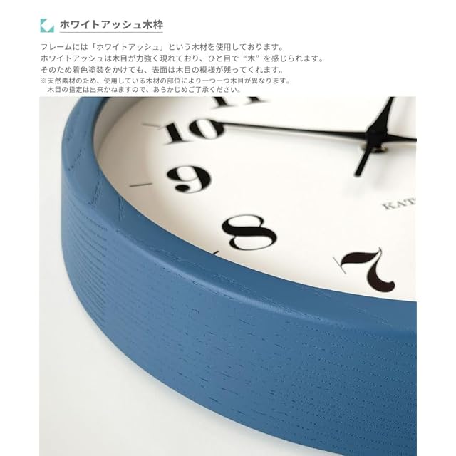 サイズ:約Φ306×50mm 重量:約900g 材質:アッシュ、ガラス、MDF 生産国:日本 カラー:ブルー 仕様:スイープムーブメント 付属品:説明書、保証書、単3電池、壁掛け用ネジ