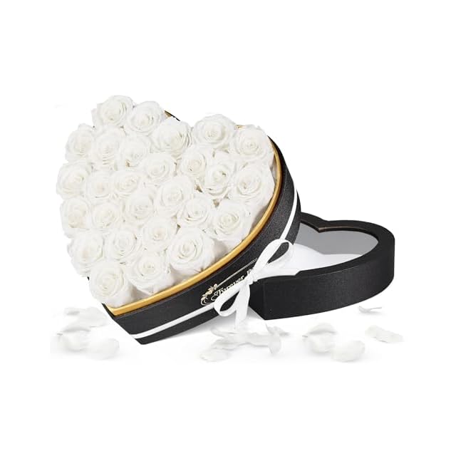 【セット内容】27輪白いプリザーブド薔薇(薔薇の直径は約4cm)、メッセージカード、リボン、ハート窓付きシルクボックス(サイズ約24*24*12cm)。また、外箱が付いているため、配送中の破損の心配もありません。
