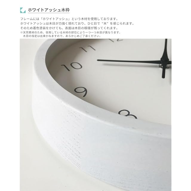 【商品説明】無垢材を汲み上げ、綺麗な曲線になるまで丁寧に削り上げた木枠の時計。 枠にホワイトアッシュの無垢材を使用したことで、重厚感と、塗装した上からでもはっきりとした木目が楽しめます。 文字盤には、すっきりとした丸ゴシックの文字を使用し、 針には、尾の長いくびれのある可愛らしいものを使用しました。 それにより、重厚感のあるホワイトアッシュの木枠と、文字や針がマッチして シンプルで可愛らしい時計になりました。 また、ムーブメント(機械部)はスイープタイプ(連続秒針)を採用しております。 そのためかちこち音が気にならず、静かな場所でもお使いいただけます。