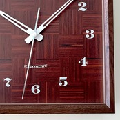 細く美しい四角い木枠に、千切り加工を加で強度を高め、繊細ながらも力強さを表現しました。文字盤はかつて製作した寄木を、印刷技術を用いて再現した、木目調文字盤です。スイープムーブメントを使用しているため、音もほとんどありません。