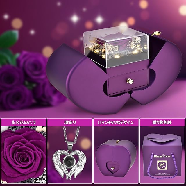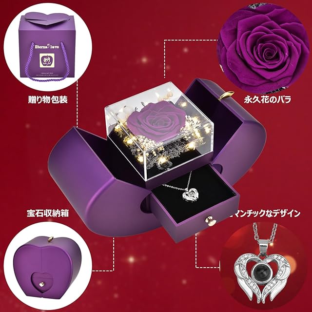 「多用途の究極ギフト選択」 ギフトを選ぶことは、深い感情を表現し、愛情と感謝を伝える重要な行為です。誕生日、バレンタインデー、クリスマス、感謝祭、記念日、プロポーズなど、あらゆる特別なシーンにぴったりです。 当社のこのギフトは、「100 種の愛の言葉」が刻まれたネックレスと、美しいプリザーブドフラワーが見事に融合されており、贈りたい真摯な気持ちを正確に相手の心に届けます。 このギフトは、各要素が深く考えられ、プレゼントとしての特別感を最大化しています。この永生花とネックレスのギフトセットを贈るたびに、あなたの思いやりと愛情が伝わり、相手に特別な喜びをもたらします。 様々な機会に最適なこのギフトを、ぜひご選択ください。