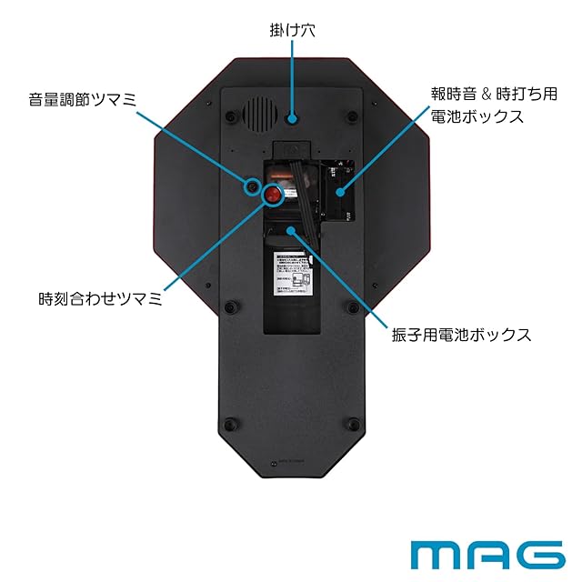 機能:連続秒針、16曲メロディ&ボンボン時打ち報時機能 (1ザ・ブルーベルズ・オブ・スコットランド、2ザ・ファーマー・イン・ザ・デル、3フォー・エリーゼ、4ホーム・オン・ザ・レンジ、5ロング・ロング・アゴー、6メヌエット、7トロイメライ、8ヴィーゲンリート、9トイ・シンフォニー、10オールド・ブラック・ジョー、11ローレライ、12メリーファーマー、13ホーム・スウィート・ホーム、14スワン・レイク、15ハッシュ・リトル・ベイビー、16セレナーデ)、報時自動鳴り止め機能 (午後10: 00~午前5: 00)、音量無段階調節 、振り子