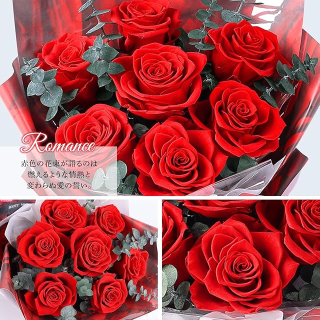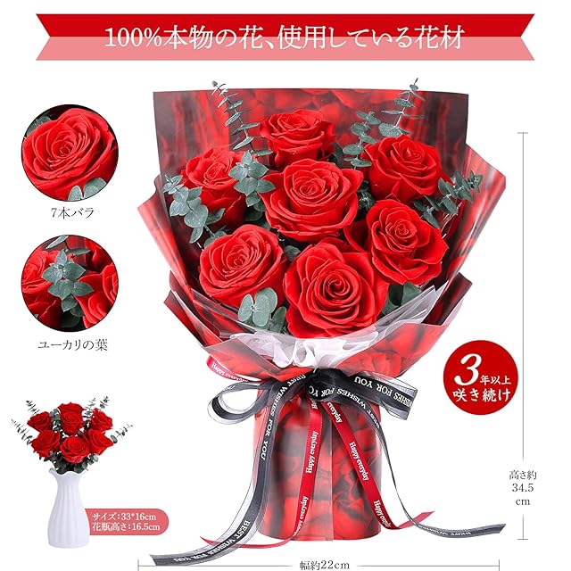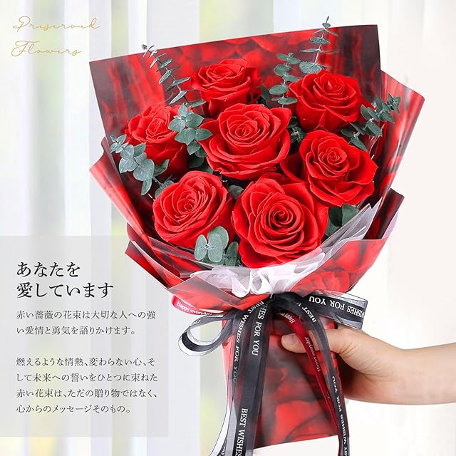【手入れ不要、3年以上咲き続ける】この7本バラ花束は、日本から発展したプリザーブドフラワー技術を用い、高品質な生花とバラを選んで丁寧に加工されています。生花のように儚く枯れることがなく、3年以上その美しさを保ちます。さらに、水やりやお手入れが不要で、そのまま飾って花の美しさを気軽に楽しむことができます。