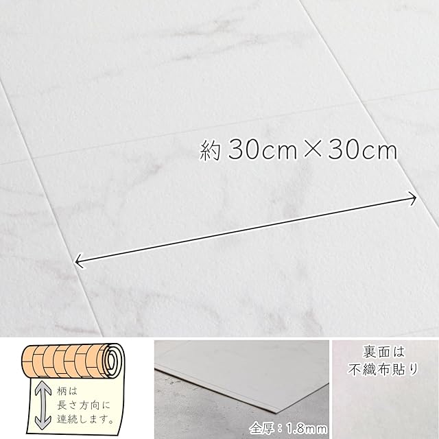 全厚:1.8mm 板巾:約11.4cm 柄リピート:長さ91×幅91cm ※商品の特性上、目地が正確に合わない場合がありますので含みおきください。
