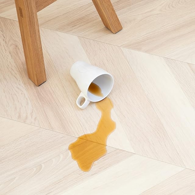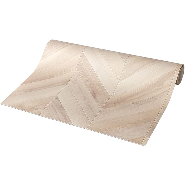 床材の端を斜めにカットした平行四辺形を山形に並べたフレンチヘリンボーン柄は控え目で上品な雰囲気に。木目の板巾は約9.3cm。水や汚れに強く、リアルな質感を感じられる、おしゃれな床保護リメイクシート。汚しても拭くだけのかんたんお手入れ。適度なクッション性で床を傷から保護。リビングのフローリング、キッチンや洗面所などの水回り、玄関などの床を簡単にリメイクできます。
