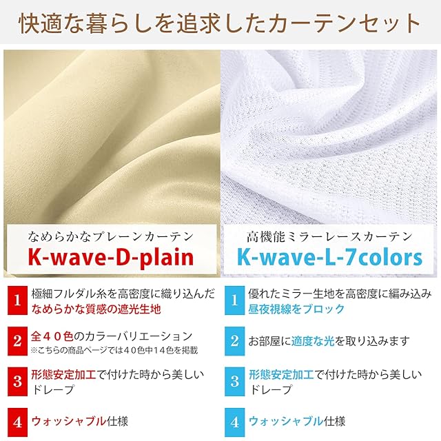 縫製:1.5倍ヒダ/ 2ッ山 /形態安定加工 組成:ポリエステル100% フック:(K-wave-D-plain)アジャスターフック付き(標準Aフック仕様) (K-wave-L-7colors)アジャスターフック付き(標準Aフック仕様) 機能:(K-wave-D-plain)遮光1級 / 防炎 / 形態安定加工 / ウォッシャブル(洗濯可) (K-wave-L-7colors)UVカット約92.1%カット / 昼夜目隠し / 断熱効果30.7% / 保冷・保温効果24.5% / 防炎 / 形態安定加工 / ウォッシャブル(洗濯可) ※幅サイズ、125cm・150cm・200cmの商品については必ず生地と生地のつなぎ目が入ります(幅継ぎ) 幅継ぎについて・・・こちらの商品は幅150cmの生地を用いて1.5倍ヒダで製作しているため、幅が100cmを超えるカーテンを製作する際には2枚の生地を継いでの製作となり、生地と生地のつなぎ目が入りますこと、予めご了承のうえご検討をお願い致します。