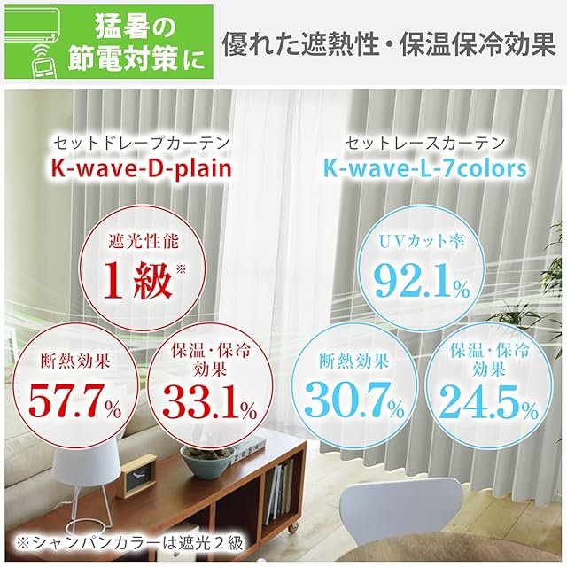 縫製:1.5倍ヒダ/ 2ッ山 /形態安定加工 組成:ポリエステル100% フック:(K-wave-D-plain)アジャスターフック付き(標準Aフック仕様) (K-wave-L-7colors)アジャスターフック付き(標準Aフック仕様) 機能:(K-wave-D-plain)遮光2級 / 防炎 / 形態安定加工 / ウォッシャブル(洗濯可) (K-wave-L-7colors)UVカット約92.1%カット / 昼夜目隠し / 断熱効果30.7% / 保冷・保温効果24.5% / 防炎 / 形態安定加工 / ウォッシャブル(洗濯可) ※幅サイズ、125cm・150cm・200cmの商品については必ず生地と生地のつなぎ目が入ります(幅継ぎ) 幅継ぎについて・・・こちらの商品は幅150cmの生地を用いて1.5倍ヒダで製作しているため、幅が100cmを超えるカーテンを製作する際には2枚の生地を継いでの製作となり、生地と生地のつなぎ目が入りますこと、予めご了承のうえご検討をお願い致します。