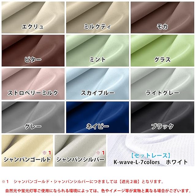 K-wave-D-plainのお色は40色、サイズは幅100cm・125cm・150cm・200cmの4サイズ×丈80cm~250cmの35サイズ、計140サイズご用意しております。