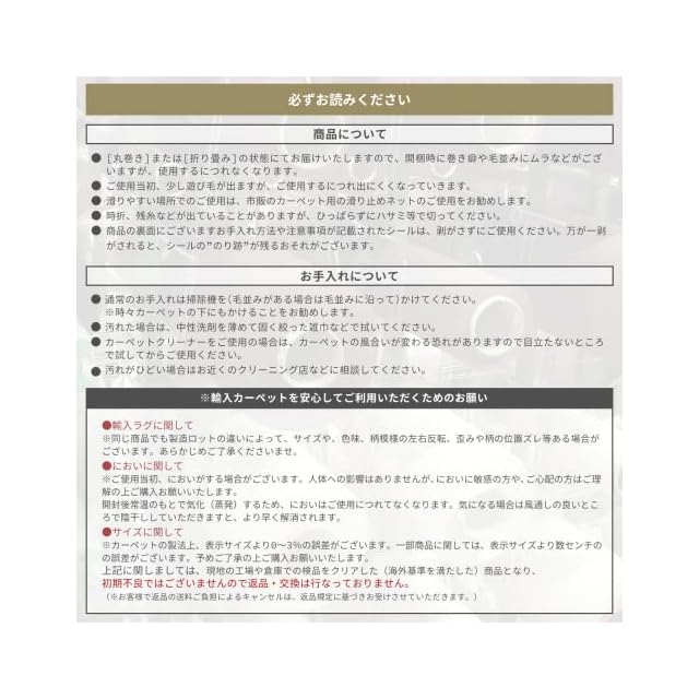 【輸入カーペットを安心してご利用いただくためのお願い】 ●輸入ラグに関して ※同じ商品でも製造ロットの違いによって、サイズや、色味、柄模様の左右が反転していたり、位置がズレている場合がございます。ただし、現地の工場や倉庫での検品をクリアした商品を輸入しています。あらかじめご了承くださいませ。●においに関して ※ご使用当初、ラグ裏面に塗られる仕上げの接着塗料(ラテックス剤)のにおいがする場合がございます。人体への影響はありませんが、においに敏感の方や、ご心配の方はご理解の上ご購入お願いいたします。開封後常温のもとで気化(蒸発)するため、においはご使用につれてなくなります。気になる場合は風通しの良いところで陰干ししていただきますと、より早く解消されます。●サイズに関して ※カーペットの製法上、表示サイズより0~3%の誤差がございます。※いずれも商品の初期不良ではございませんので返品・交換は行なっておりません。(※お客様で返品の送料ご負担によるキャンセルは、返品規定に基づきお受けさせていただきます。)※ラグ、マット裏面に製品シールが貼っている場合は剥がさないでご使用ください。