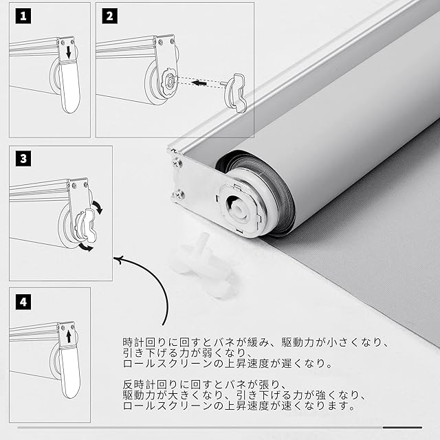 【巻き上げの速度の調節可能】垂直でチェーンに軽く引っ張ってから手を離すと、ロールスクリーンは自動的に上がります。下方向に引いて手を離すと止まります。ロールカーテンの生地の巻き上げスピードをダイヤルで簡単に調節できます。時計回りに回すとバネが緩み、駆動力が小さくなり、引き下げる力が弱くなり、ロールスクリーンの上昇速度が遲くなり。反時計回りに回すとバネが張り、駆動力が大きくなり、引き下げる力が強くなり、ロールスクリーンの上昇速度が速くなりま