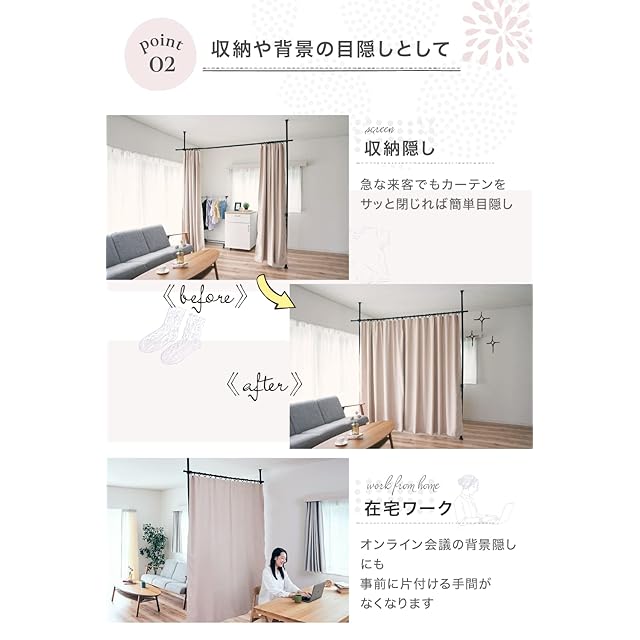 【ニーズに合わせた使い方】 テレワーク時Webカメラを使用したオンライン会議の背景隠しとして使用すればカーテンを閉じるだけで事前の片付けがなくなります。本製品のカーテンレール部分にプロジェクタースクリーンを取り付ければ自宅にいながら大画面での映画鑑賞、スポーツ観戦などが行え、充実したおうち時間が過ごせます。透明ビニールカーテンを取り付ければ飛沫防止パーテーションにもなり、事務所や店舗でもご使用頂けます。本体カラーは上品なマット仕上げ、設置場所を問わないデザインとなっています。