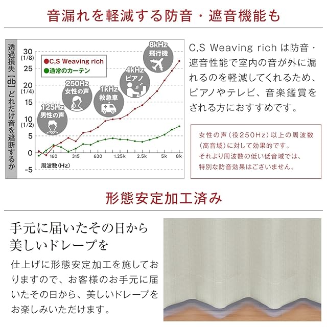 機能:遮光 / 1級遮光・断熱効果約59.7%・保温効果約35.3%・形態安定加工 縫製:1.5倍ヒダ / 2ッ山ヒダ フック:アジャスターフック付き(標準Aフック仕様) 組成:ポリエステル100% 洗濯:水丸洗いOK(手洗いをおすすめします) 日本製 ※幅サイズ、125cm・150cm・200cmの商品については必ず生地と生地のつなぎ目が入ります(幅継ぎ) 幅継ぎについて・・・こちらの商品は幅150cmの生地を用いて1.5倍ヒダで製作しているため、幅が100cmを超えるカーテンを製作する際には2枚の生地を継いでの製作となり、生地と生地のつなぎ目が入りますこと、予めご了承のうえご検討をお願い致します。