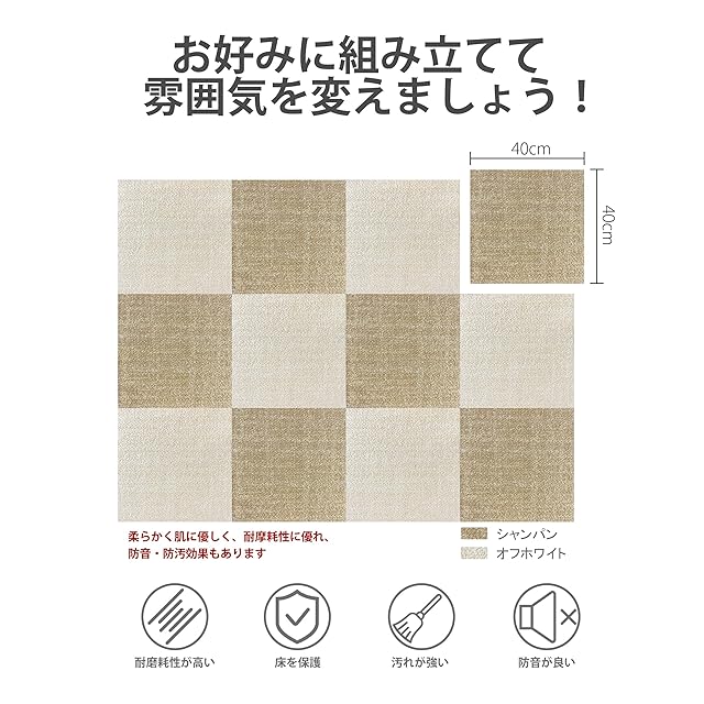 タイルカーペット ジョイントマット Azaeahom 防音マット 厚手9mm 40cm×40cm 12枚 大判 ずれない カーペット フロアマット 置くだけ 防音 保温 洗える 防炎 制電 防ダニ 遊び毛無し 床暖OK 滑り止め DIY (YX01-125 シャンパン)