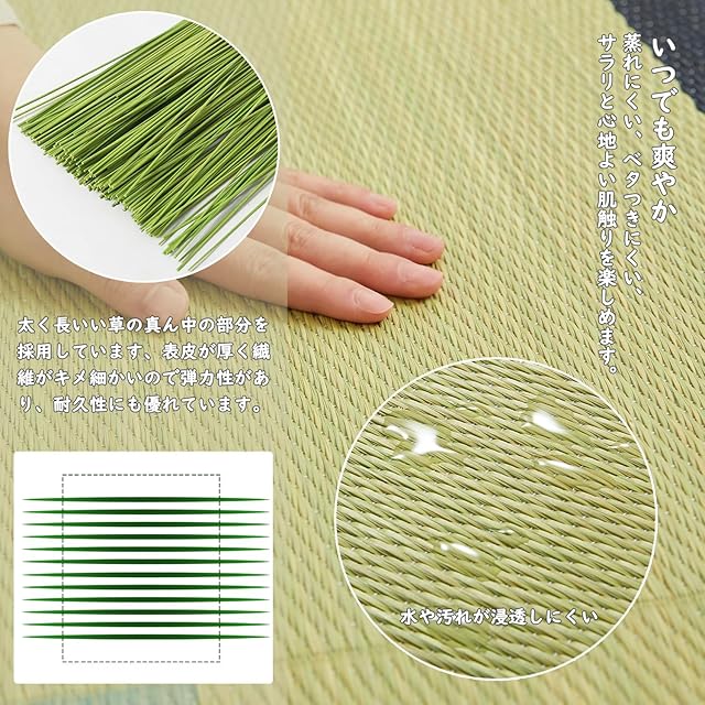 【優れた使い心地】い草には蒸れにくい、ベタつきにくい特性があり、シーンを問わずいつも爽やか、サラリとした肌触りをキープできます;い草本来の弾力性に加えて中材は厚さ8mmのウレタンフォームを使用しております、ほどよいクッション性とボリューム感があり、ふっくらとした踏み心地を楽しめます;座ったり寝転んだりして、気持ちよくゴロゴロしたくなります;また、ドット樹脂加工を施した不織綿で裏張りしており、床を傷つけず、ずれにくく滑り止め効果をUPさせます。