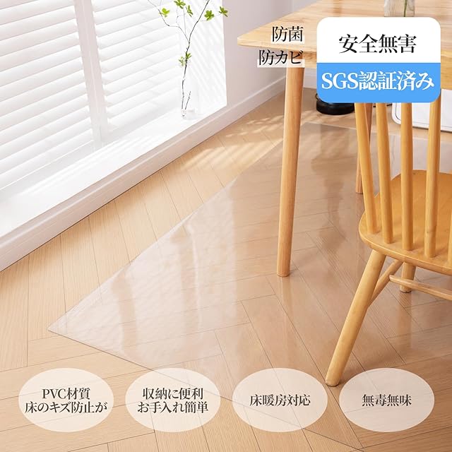 【ダイニングマット・傷防止マット】PVC 床 保護シート クリア 透明マット は水や汚れを吸わないPVC素材なので汚れても拭き取るだけでOK!落下物による凹みや、落とせにくい汚れなどによる床の傷付きを防ぎます。より安全性高い素チェアマット品はSGSの検証で無毒のエコ素材です、抗菌・防臭の合格基準より2.8倍以上高く完成しました!
