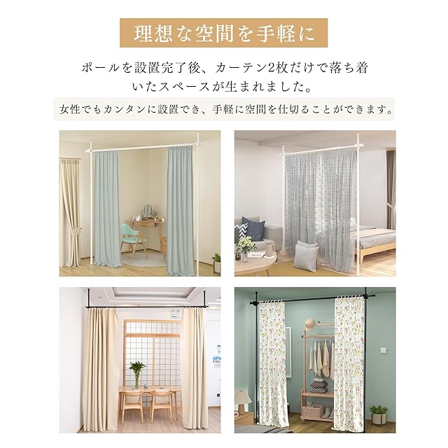 【理想な空間を手軽に】ポールを設置完了後、カーテン2枚だけで落ち着いたスペースが生まれました。女性でもカンタンに設置でき、手軽に空間を仕切ることができます。