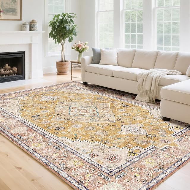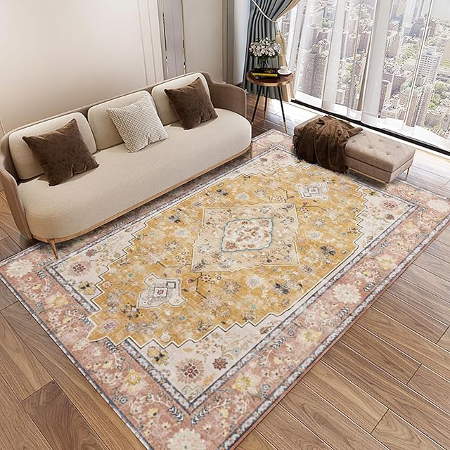 【ソフトな模倣カシミヤ】サイズ: 約120x160cm。カラー: イエロー。原産国: 中国。高品質のポリエステル繊維で作られたカーペットは、雲のように柔らかく繊細な感触を持ち、比類のない足元の感覚を提供します。ショートパイル玄関マット 室内の厚さはわずか0.5cmで、毛羽立ちには適していません。ペルシャ絨毯は入口や家具の下に簡単に置くことができます、ドアに引っかかったり他の人につまずいたりすることはありません。