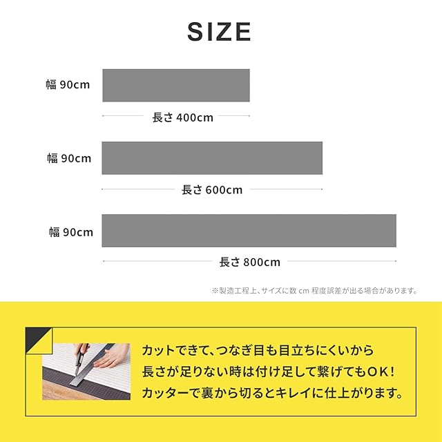 ハサミやカッターで簡単にカットできるので廊下などの幅や長さにあわせて敷き詰めることができます。床のキズ防止やペットの足腰への負担軽減、防音、冷え対策などにおすすめです。