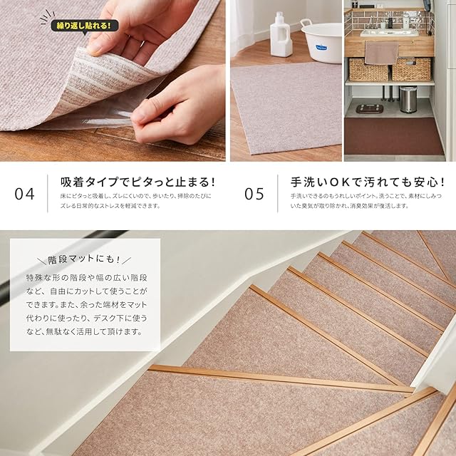 廊下やキッチンなどに敷きやすいロングタイプの吸着マットです。裏面の保護フィルムを剥がして置くだけで、滑りにくくピタッと敷くことができます。