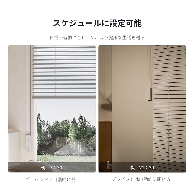 【タイマー設定】タイマー設定により、平日の朝7時にブラインドが定時的に自動的に開きます。