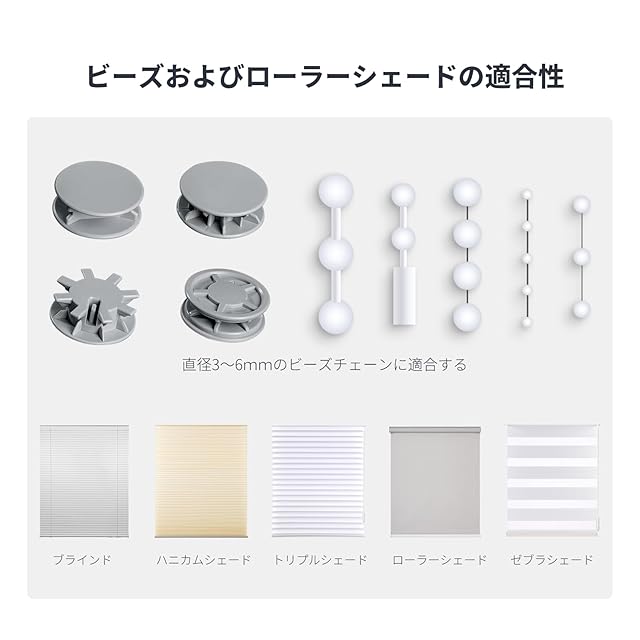 【取り付け簡単】電動ブラインドのモーターを壁に取り付け、アダプターを取り付け、ローラーシェードのビーズコードを挿入するだけでOKです。ただし、プラスチック/金属ビードの厚みが3~6mmのローラーブラインドにのみ使用可能です。※異なるビードには異なるディスクが必要ですので、順調に作業するために適切なディスクを使用してください。(ネジ2本、延長チューブ2本、両面テープ1個が付属しています)