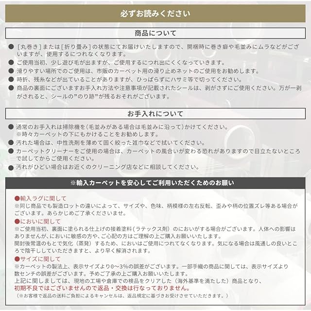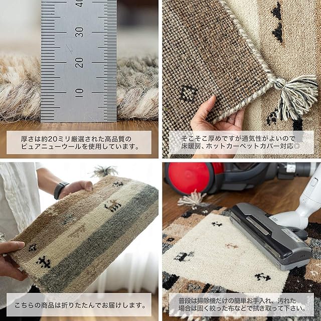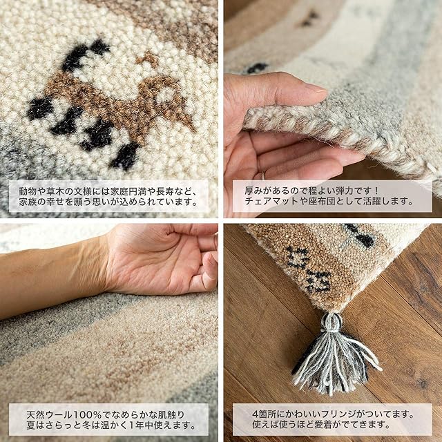 【お取り扱いのご注意】●手織のため、数センチの誤差がございます。また、サイズに応じてデザインの異なる場合がございます。予めご了承の上ご購入お願いいたします。●素材の性質上、最初は遊び毛がでますが、ご使用の内にだんだんと少なくなっていきます。●滑りやすい場所でのご使用は市販のカーペット用の滑り止めネットのご使用をお勧めします。●汚れた場合は、カーペットクリーナー、中性洗剤などを薄め固く絞ったタオルなどで拭き取ってください。
