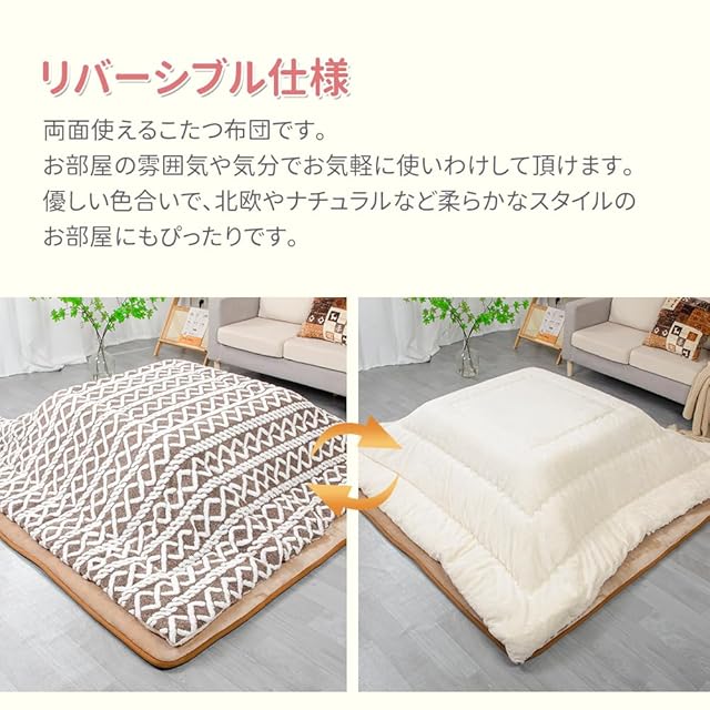 【インテリアに合わせやすい】柄プリントとは異なる陰影や質感がアクセントになり、お部屋をおしゃれに見せてくれるこたつ布団。ふわふわな極上のタッチ感で暮らしに幸せをお届けします。
