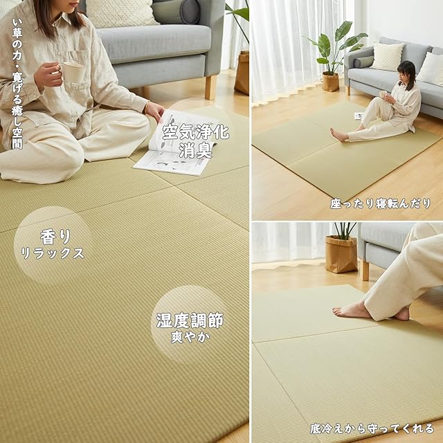 い草には蒸れにくい、ベタつきにくい特性があり、シーンを問わずいつも爽やか、サラリとした肌触りをキープできます;室内に置けば、タバコ臭やペット臭、汗臭、足の臭いなどを軽減し、心を落ち着かせる香りが広がり、くつろげる癒し空間を楽しめる上、ジメジメを解消し湿度を快適に保つことで体に優しく、夏は涼しく冬は暖かく使うことが出来ます。芯材は不織布ボード+EPEボード、軽量で、保温断熱効果や通気性、吸音遮音性、耐久性がありながら、い草の弾力性に加えてクッション性にも優れて踏み心地が良いです;座ったり寝転んだりして、気持ちよくゴロゴロしたくなります。