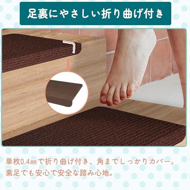 階段 滑り止めマット 折り曲げ付 ずれない 【15枚】大判 約70×22cm 階段滑り止めマット 吸着階段マット 階段用ステップマット 階段カーペット 転倒防止 キズ防止 防寒 カットOK 洗える 防音 ペット シニア 足腰負担軽減 安全対策 四季通用 (折り曲げ70×4.5cm)