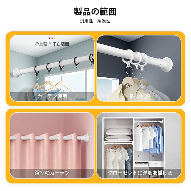 【簡単な取付け・取出し】つっぱり棒は、ネジやクギを使わずに突っ張るだけで取り付けできるので、壁を傷つけることがありません。賃貸住宅にぴったり!使用できまつっぱり棒、クローゼットロッド、室内カーテンロッド用、浴室タオル掛け用、風呂場シャワーカーテン用、部屋干し用、洗濯干し、布団干し、物干し竿、キッチン用品収納