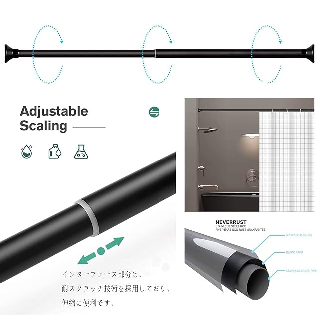 【製品設計上の理由】潮風による腐食を防ぐため、ステンレス鋼の表面にはコーティング加工を施しています。塗装工程でステンレス鋼管の色を変えながら、製品の防水性能と防錆性能を向上させます。黒、白、18個の無料カーテンリング。使用中により良い選択肢をお客様に提供します。シャワーカーテンロッド、収納ロッド、ワードローブ、洋服ロッドとして使用できま