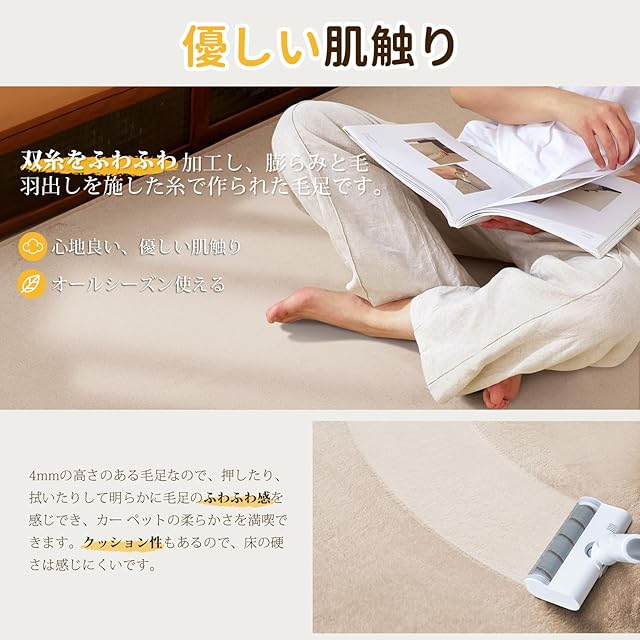 【優しい肌触り】毛足は双糸をふわふわ加工し、膨らみと毛羽だしを施した糸で作られ、心地良い、優しい肌触りを実現しました。毛足の長さは4mmで、暑くも寒くも感じないです。