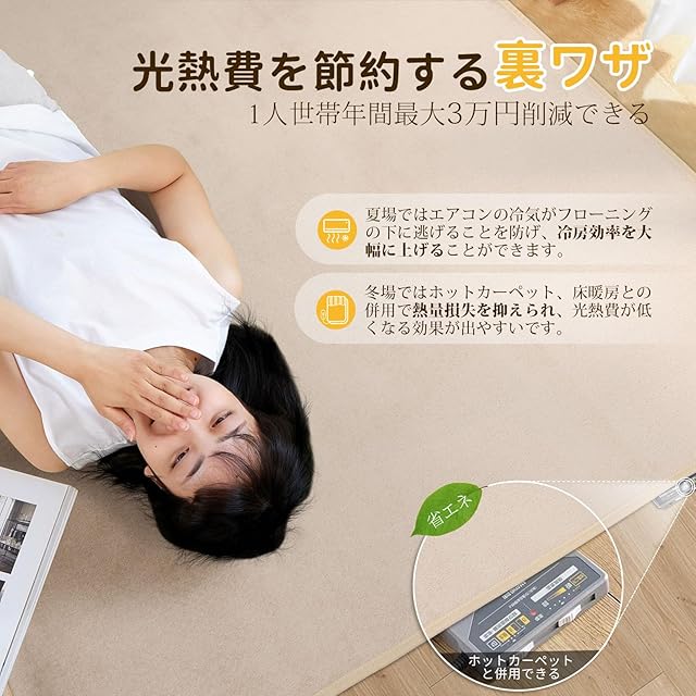 【省エネラグ】夏場ではラグはエアコンの冷気がフローニングの下に逃げることを防げ、冷房効率を大幅に上げることができます。冬場ではラグ、ホットカーペット、床暖房との併用で熱量損失を抑えられ、光熱費が低くなる効果が出やすいです。1人世代では年間最大3万円削減できるラグです。