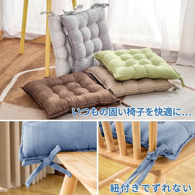 【紐付きでずれない】紐付きのシートクッションで、お家のダイニングチェアや、職場のPCチェアなどを使いやすく!動かすことの多いダイニングの椅子でも、紐付きだから、固定出来て、ズレません。