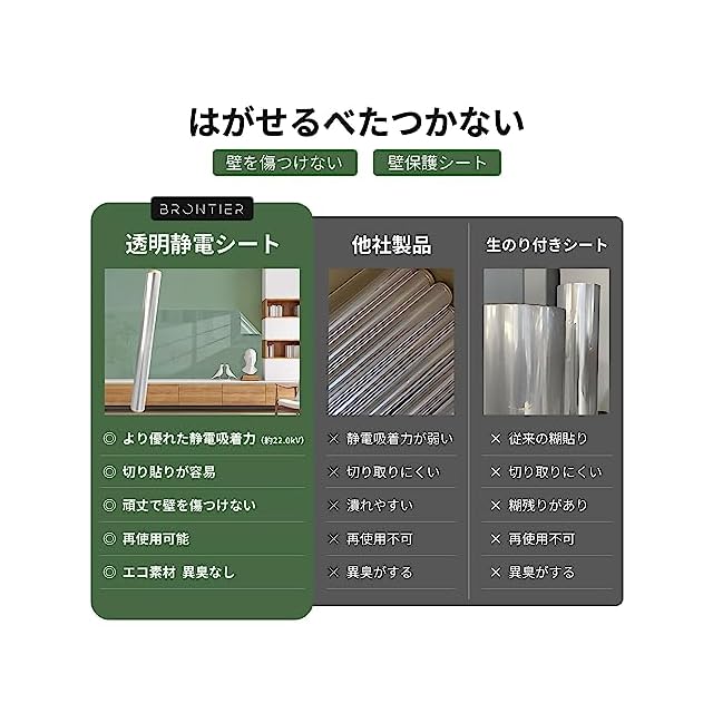 brontier 壁汚れ防止シート 静電気 壁保護シート 防水防油 厚め はがせる 透明 壁紙 保護フィルム キッチン 爪研ぎ防止シート 猫 落書き対策 キズ防止 汚れ防止 賃貸OK 貼るだけ簡単 べたつかない 道具付き (60cmx10m)