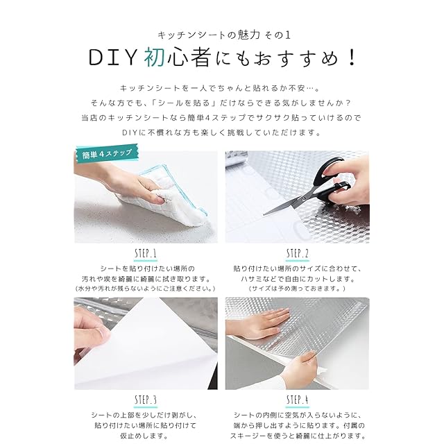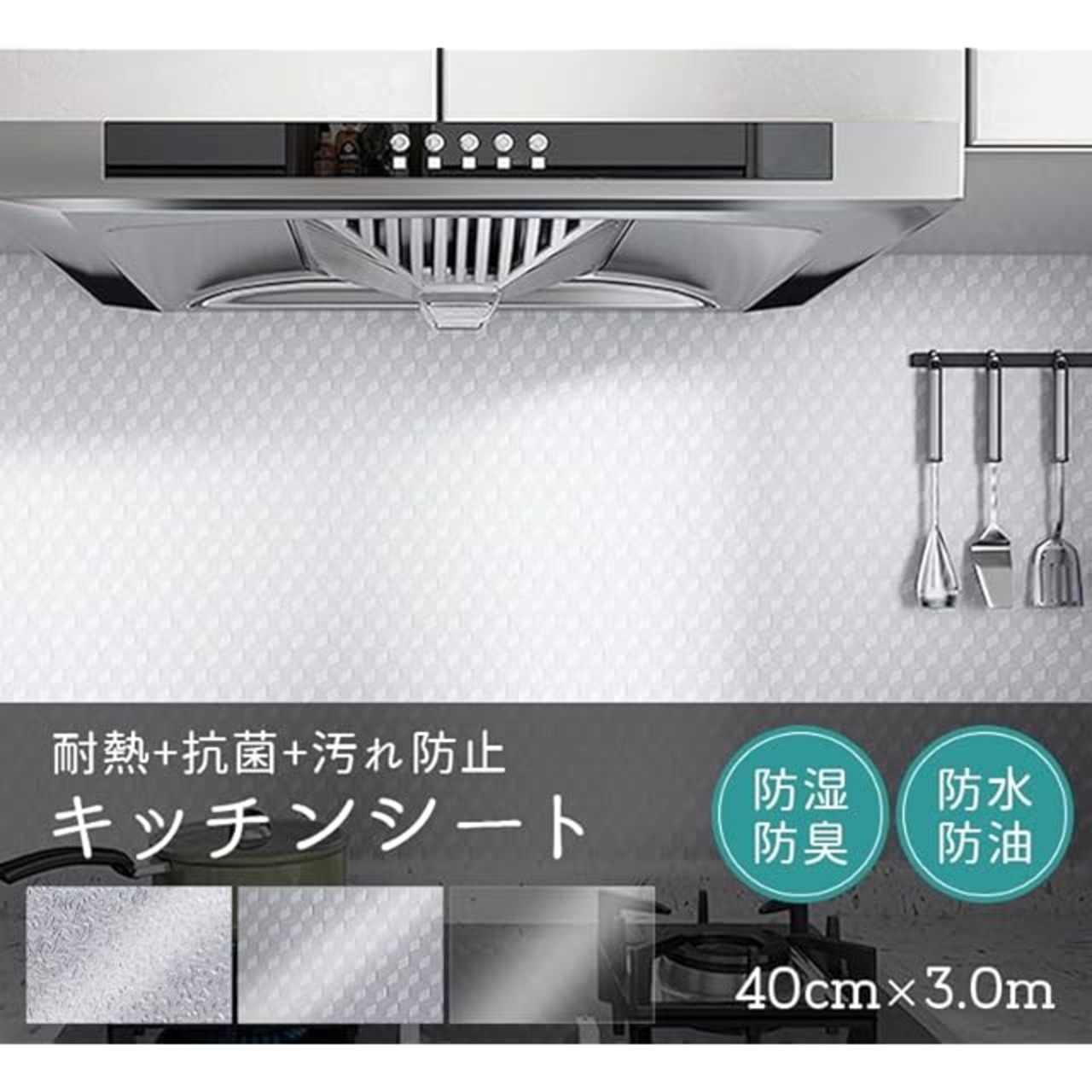 【汚れを弾き、サッと拭くだけで綺麗に!】 お掃除が大変な油汚れや、水垢、調味料の飛び散りなども水拭きや中性洗剤を使って簡単に拭き取ることができます 【耐熱温度110℃以上!熱に強く、燃えにくい素材】 耐熱性に優れているので火気の近くでも安心♪コンロやレンジ周りの壁にも貼れます。油汚れにも強いので揚げ物や炒め物の際の厄介な油ハネの掃除も簡単に!※耐熱温度は柄によって異なります。[op1tアルミエンボス:~110℃] [op2tアルミブロック:~110℃] [op3tクリア:~180℃]