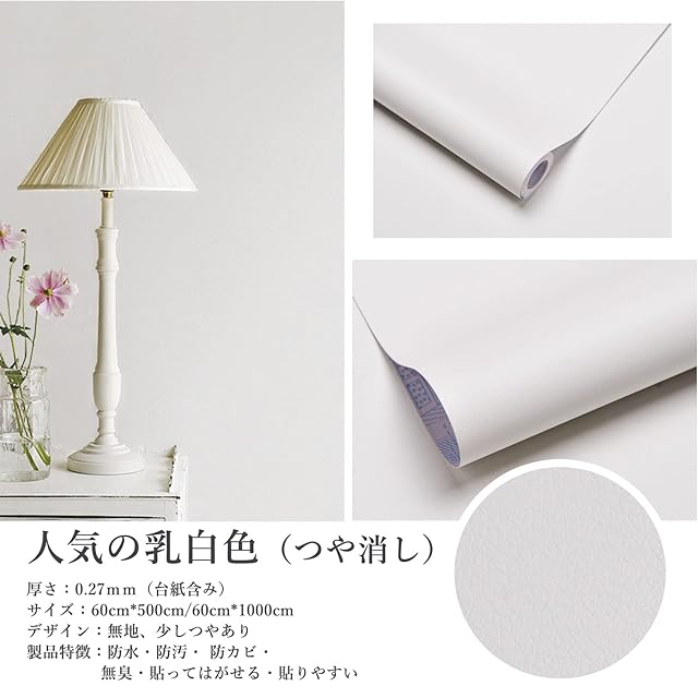 サイズ:約60cm×5m。色:ホワイト。一般の壁紙シールより厚いで地下が透けることがない。