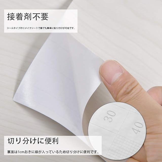 【貼り付け簡単・賃貸OK】シートの裏面はシール状になっていて、施工するときは台紙を剥がしてペタッと貼るだけ。0.29mmもある厚手の壁紙なので下地が透けなく、貼り付け時に空気が入りにくく貼りやすいです。また、60cm幅なので初心者でも簡単にリメークができ、時間も短縮!